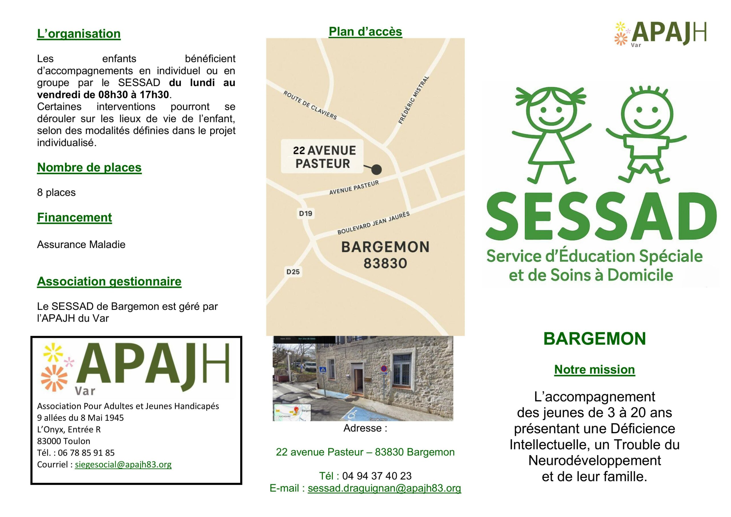 Le SESSAD de Bargemon est géré par l’Association pour Adultes et Jeunes Handicapés (APAJH) du Var et financé par l’Assurance Maladie. Sa mission est d’accompagner les jeunes de 3 à 20 ans présentant une déficience intellectuelle, un trouble du neurodéveloppement et de leur famille.
