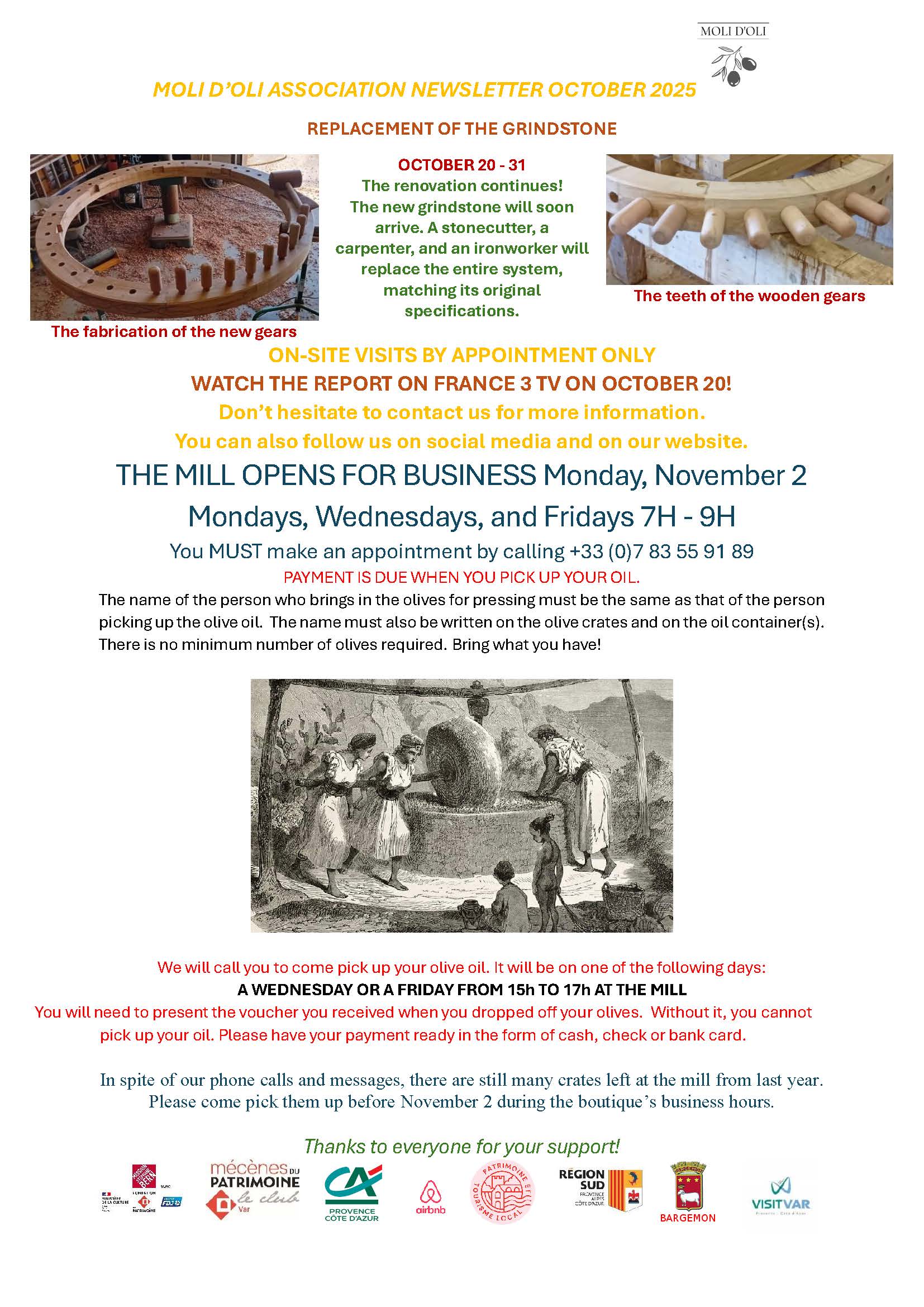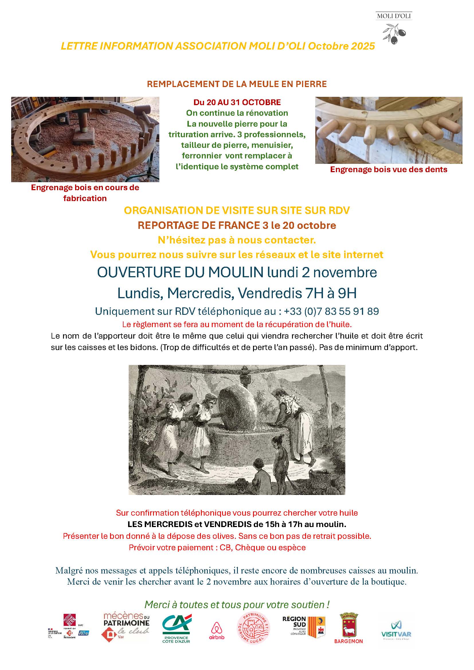 – Ouverture du moulin le lundi 3 novembre 2025 : les lundis, mercredis et vendredis de 7h00 à 9h00 uniquement sur RDV tél : +33 (0) 7 83 55 91 89.