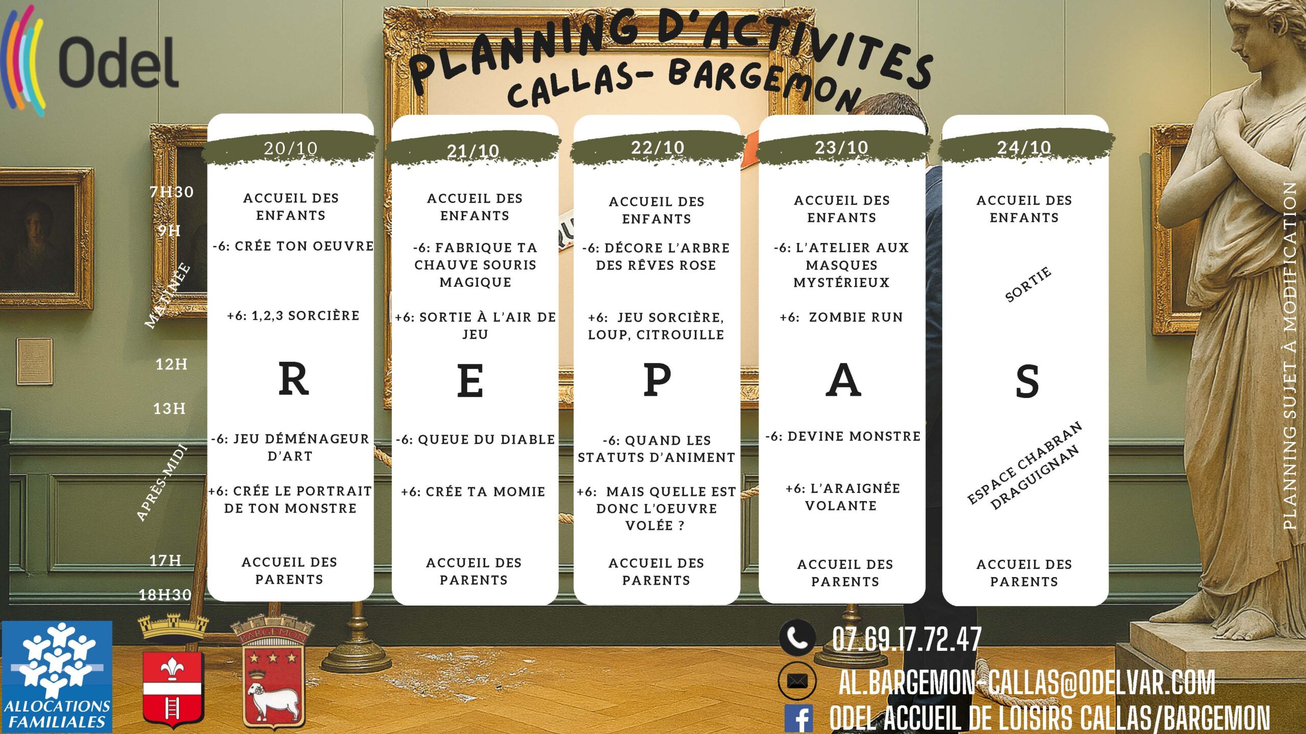 Programme d’activité ODEL VAR Callas-Bargemon pour les vacances scolaires de la Toussaint.