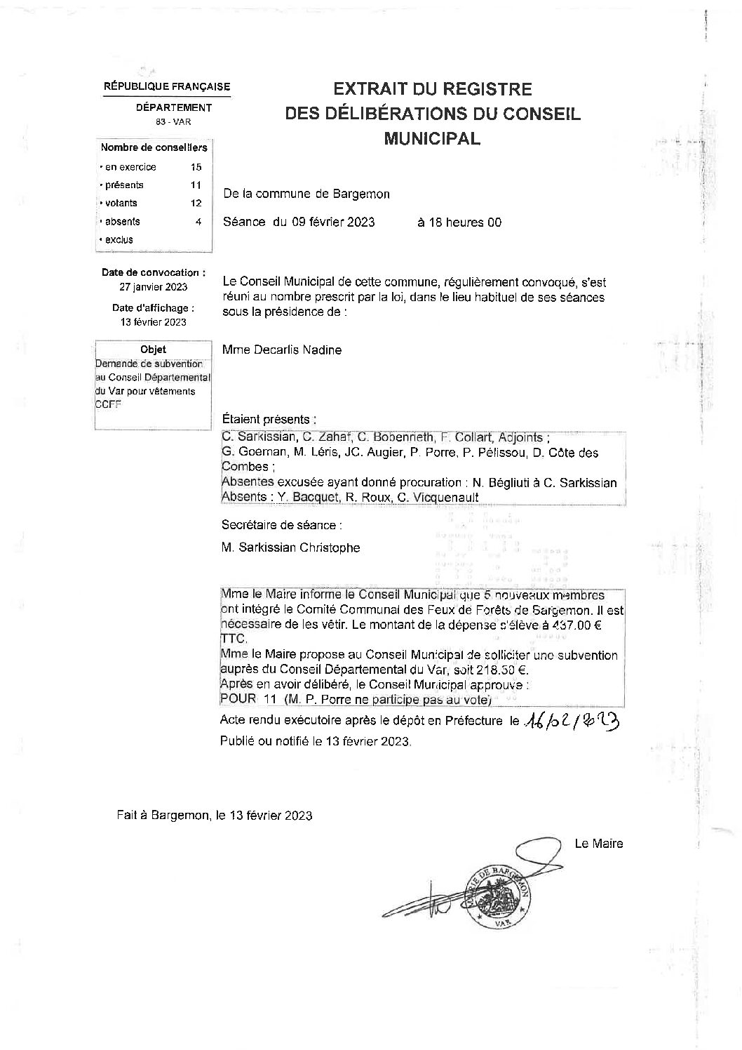 Délibération n° 1 - Demande subvention vêtements CCFF
