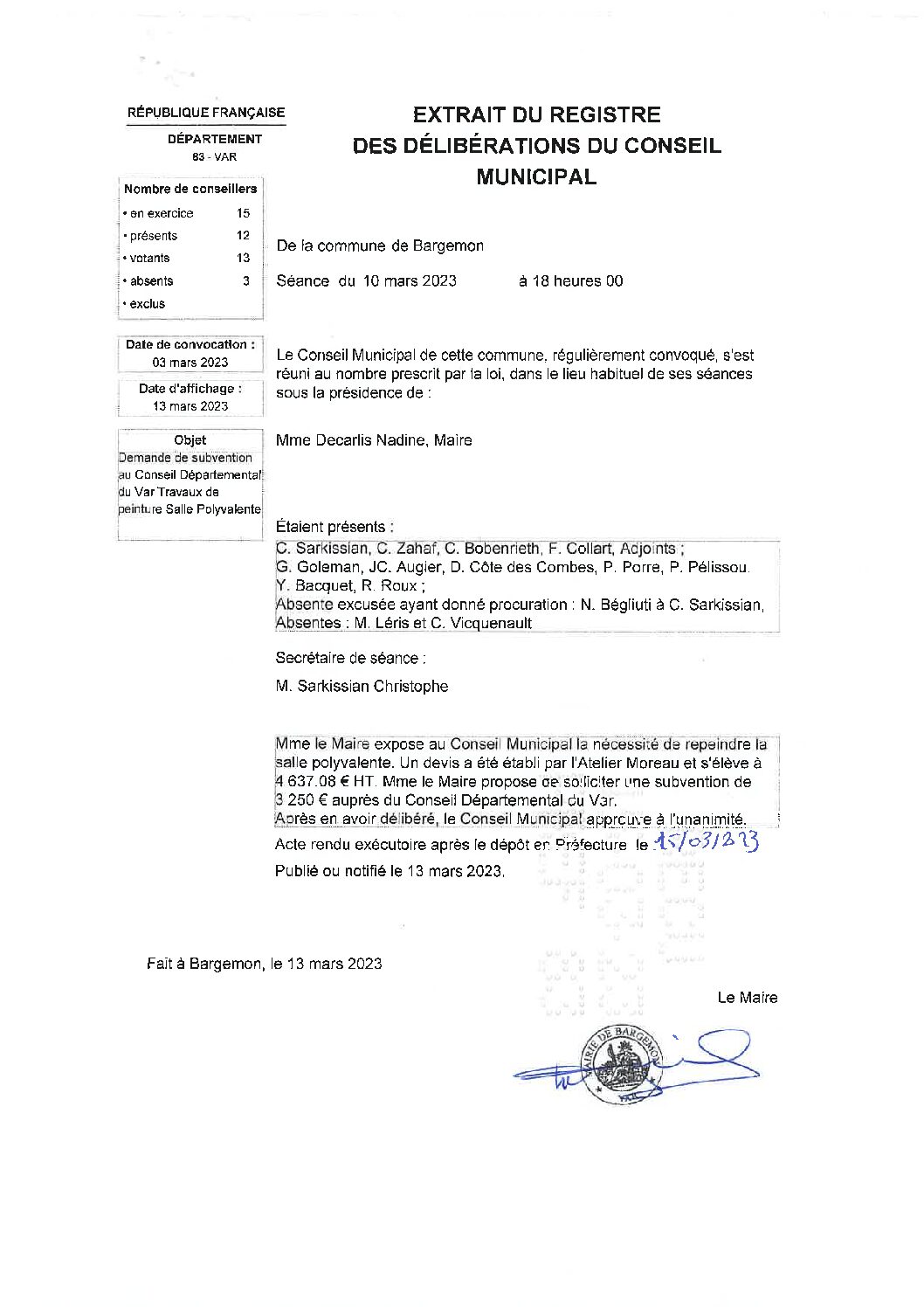 Délibération n° 9 - Demande subvention CD Var peinture salle polyvalente
